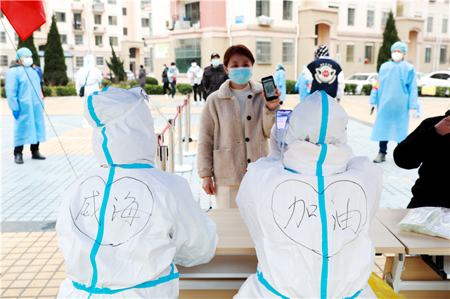 信息录入、维持现场秩序、协助上门采样……这几天,同样奋战在一线的还有环翠区13个区直部门的150余名志愿者,他们下沉到张村镇各个社区,只为共同打赢这场疫情防控阻击战。