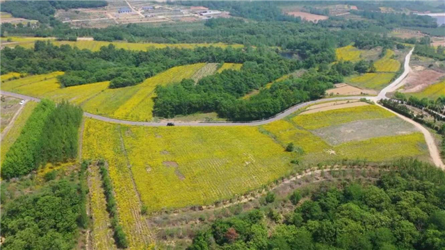 这是一幅美丽乡村的生动画面。一朵朵金黄色的花儿组成金色的海洋,点燃了夏日的情怀。微风吹过,花朵迎风摆动,花田泛起金色波浪,摇曳生姿,绚丽夺目,在艳阳的照耀下熠熠生辉,与远处连绵的群山、湛蓝的天空、洁白的云朵交相辉映,呈现出生机勃勃的景象,泽头镇也因此成为全国知名的金鸡菊种子集散地。