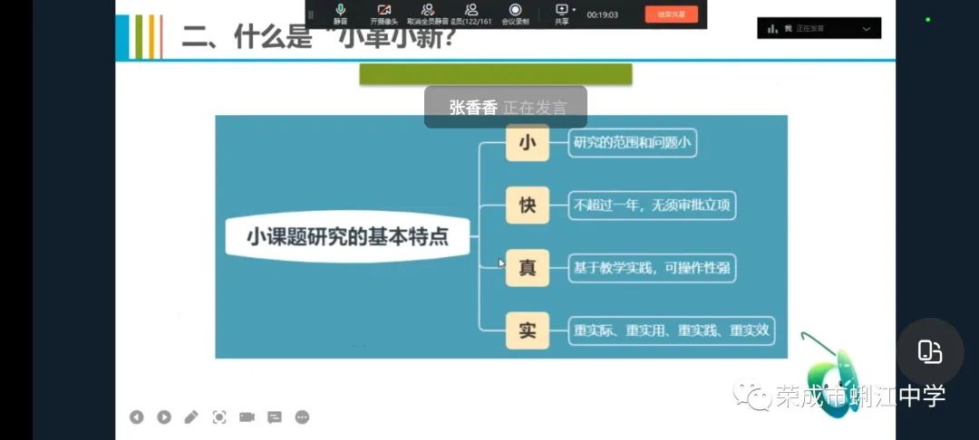 张香香老师从为什么要做“小革小新”、什么是“小革小新”、如何提出有价值的研究课题、如何实施“小革小新”项目研究、怎么撰写成果报告五个方面对“小革小新”展开讲解,内容详实具体,指导性强,使参训老师对于“小革小新”有了更加深入的了解。张老师结合具体案例讲解了课题表述容易出现的问题,给出了课题表示的常规模式;总结了小课题研究的基本流程;以“为何”、“是何”、“如何”、“好在哪里及那些不足”分享了成果报告四个部分问题的提出、目标和内容、过程与方法、成效与启示的撰写方法。