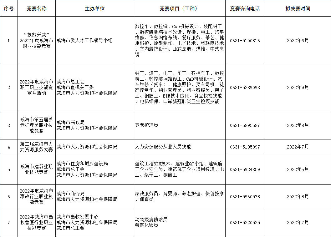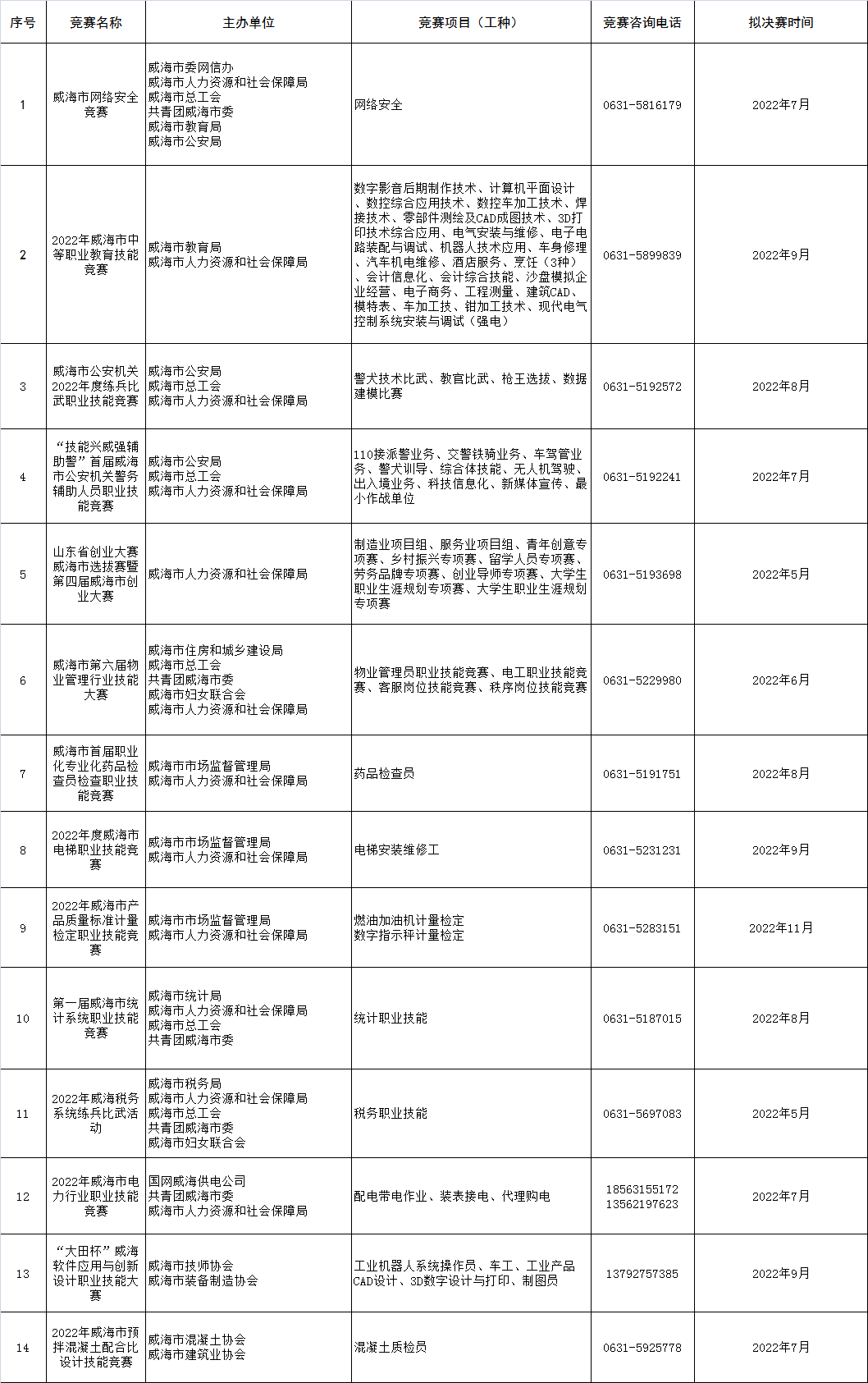 欢迎各企业职工、院校师生、自由职业者等广大技能劳动者报名参赛,具体报名参赛事宜请垂询各竞赛活动咨询电话。(来源:威海人社发布)