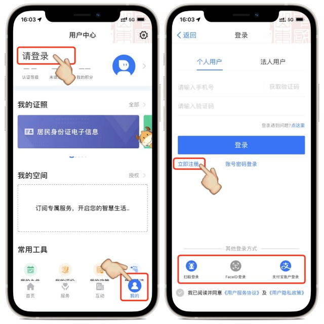 进入“爱山东”APP后,点击【我的】—【请登录】按钮进行账号注册/登录并完成实名操作认证,也可使用刷脸或支付宝账户关联登录。(*已登录用户可跳过此步)
