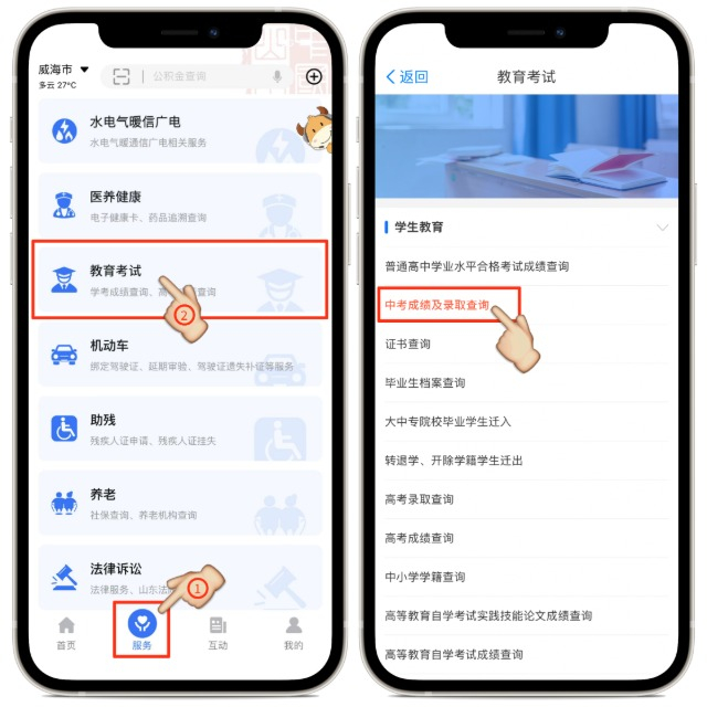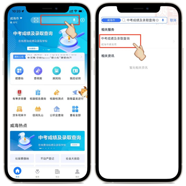 入口1:在“爱山东”APP首页上部焦点图或中部【威海热点】滚动图中,点击进入中考成绩查询通道。