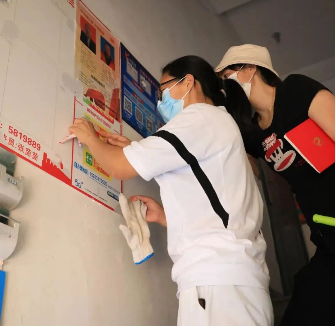 本次志愿活动内容主要是清理居民楼楼道、单元门等位置乱张贴的小广告。在清理过程中,志愿者们逐一楼道、逐一楼层进行排查,对小区楼内各个楼道的消防栓、电表箱、楼梯台阶、防盗门上张贴的小广告认真铲除清理,对不同形式粘贴的小广告采取不一样的方法进行清理:墙壁上粘贴牢固、覆盖多层、清理难度大的小广告,就用铲刀慢慢地一点一点铲除;一些印章小广告就用白色涂料喷漆进行喷涂。