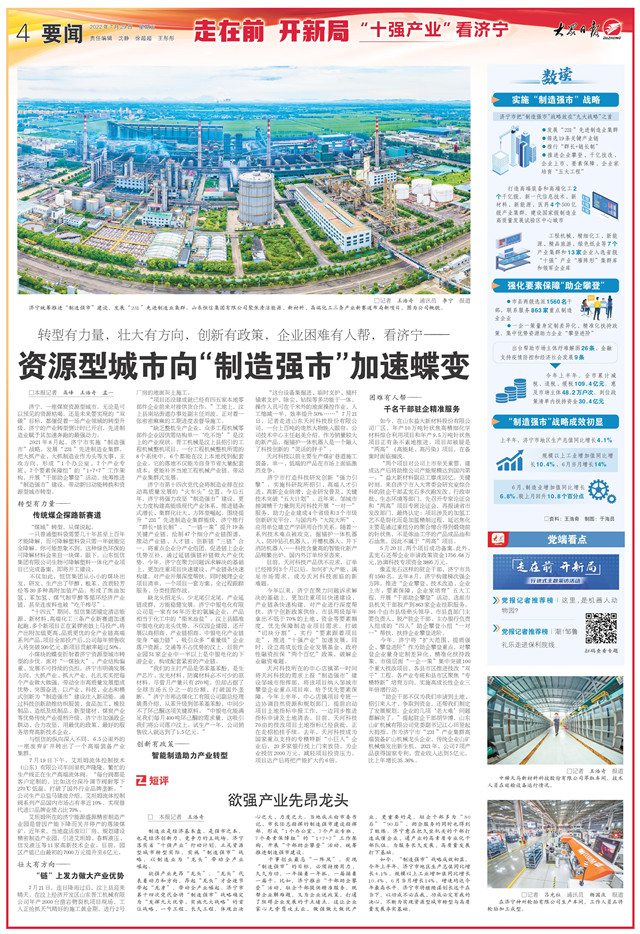 制造业是经济基本盘、是强市之本,也是经济创新力、竞争力的主战场。济宁落实省“十强产业”行动计划,立足资源型城市转型实际,实施“制造强市”战略,以制造业为“龙头”带动全产业崛起。
