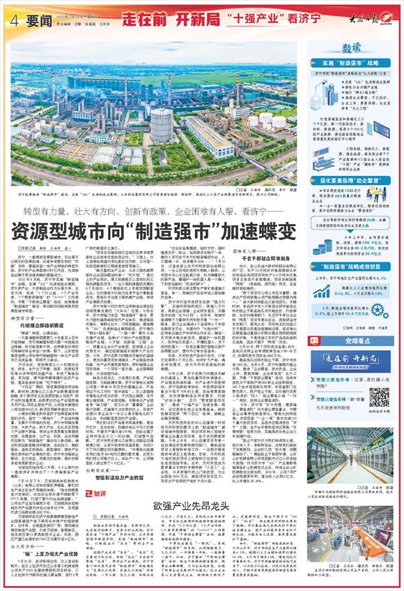 小煤块的蝶变折射着济宁资源型城市转型的步伐。面对“一煤独大”、产业结构偏重、发展不可持续的负担,济宁市明确发展方向,大抓产业、抓大产业,扎扎实实把每个产业做大做强,带动全市高质量发展塑成优势、突围奋进,以产业、科技、业态和模式创新为“制造强市”建设注入新动能。通过科技创新助推纺织服装、食品加工、橡胶制品、造纸及纸制品、新型建材、煤炭产业等优势传统产业提档升级。济宁市加强政企联动、合力攻坚,用最优的政策、最好的服务培育高新技术企业。