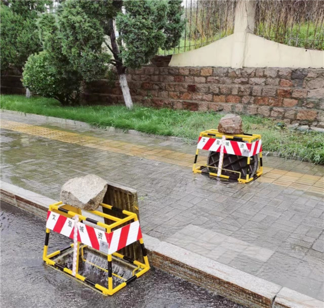 文登区累计开启重点易积水地段的雨水篦子210余个、警示旗180余个,新版防护罩30个,并安排了专人值守。