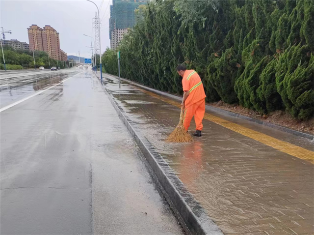 连续强降雨导致城市道路上散落了树叶等杂物,有堵塞排水口的危险,环卫人员冒雨清理排水口,打开雨篦子,加快雨水的排出。同时,相关部门配备抽水机、水泵、发电机、挖掘机、铲车、自卸车等防汛设备130余台随时待命,发现路面积水问题及时组织强排。