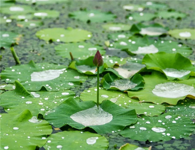 凉爽的秋雨,如大珠小珠落玉盘,荷叶里或是盛满了雨水,倾了身子倒在池塘里;或是滚了大大小小的水珠,晶莹剔透,犹如宝珠。此时风吹过,掀起碧浪翻滚,珍珠零落,再难收拾。沾满了细细雨珠的荷花,愈发清纯可人,雨后清新空气中夹了缕缕荷香,醉了游人。