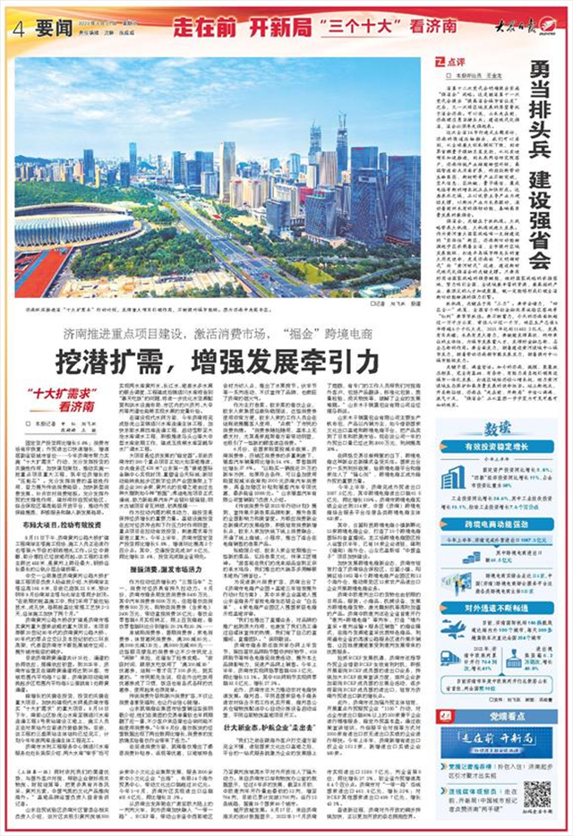 固定资产投资同比增长5.8%;消费市场有序恢复;外贸进出口快速增长,增速居副省级城市首位……今年济南市聚力实施“十大扩需求”行动,充分发挥投资的关键性作用,加快谋划策划、推动实施一批重点项目重大工程,筑牢经济增长的“压舱石”。充分发挥消费的基础性作用,着力提升传统消费能级、加快新型消费发展、补齐农村消费短板。充分发挥外贸的支撑性作用,建好用好自贸试验区、综合保税区等高能级开放平台,推动外贸保稳提质,积极服务和融入新发展格局。