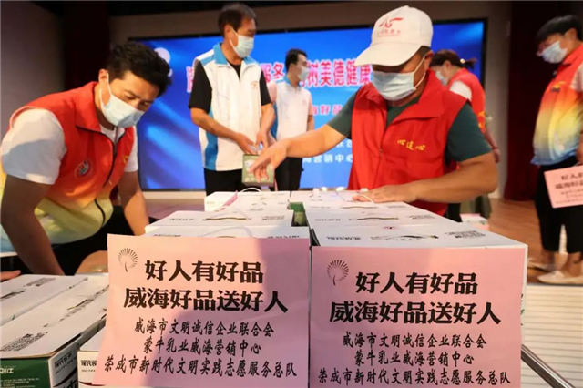 9月9日,威海市文明诚信企业联合会、蒙牛乳业威海营销中心、荣成市新时代文明实践志愿服务总队联合举办“好人有好品 好品送好人”志愿服务活动,蒙牛乳业威海营销中心为5支志愿服务团队捐赠牛奶100箱,用于团队走访优秀志愿者、困难家庭、退伍老兵等特殊群体。