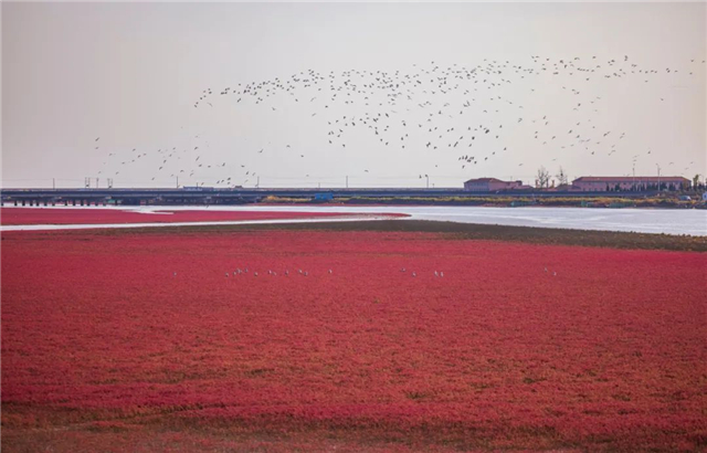深秋的南海别样红,在昌阳河入海口处,站在河畔极目远眺,有一片“红海滩”,那是翅碱蓬营造出的限定景色,除了慕名而来的游客和专业摄影家外,各种鸟儿也驻足此地,栖息繁衍。