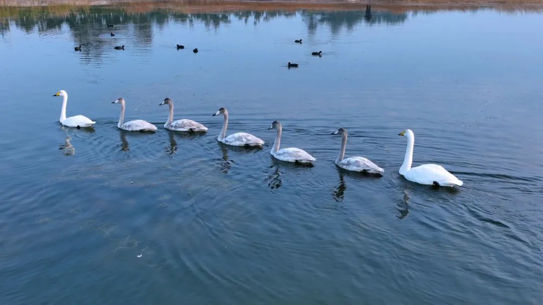 近日,摄影爱好者在南海新区发现了数只天鹅身影,它们悠闲地浮在水面上,或引吭高歌,或嬉笑打闹。