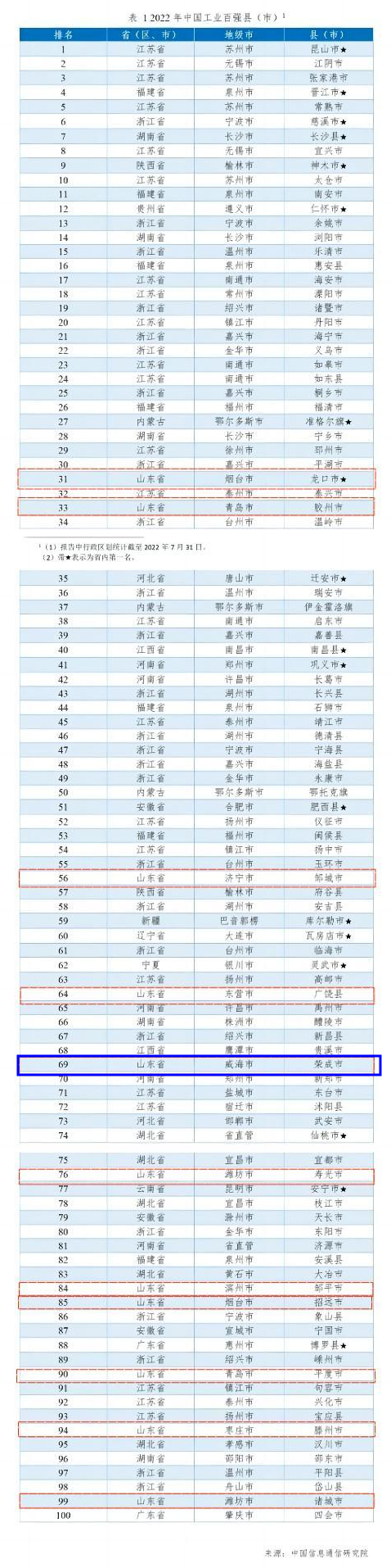 日前,中国信通院发布2022年中国工业百强县、中国创新百强县、中国工业百强区榜单。荣成市入选2022年中国工业百强县(市)、2022年中国创新百强县(市)。