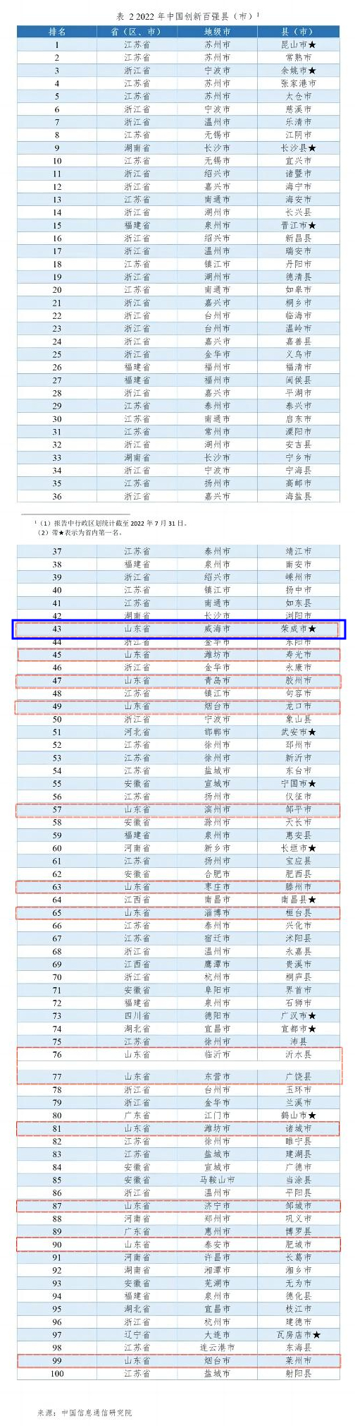 山东荣成市、寿光市、胶州市、龙口市、邹平市、滕州市、桓台县、沂水县、广饶县、诸城市、邹城市、肥城市、莱州市等入选2022年中国创新百强县(市);