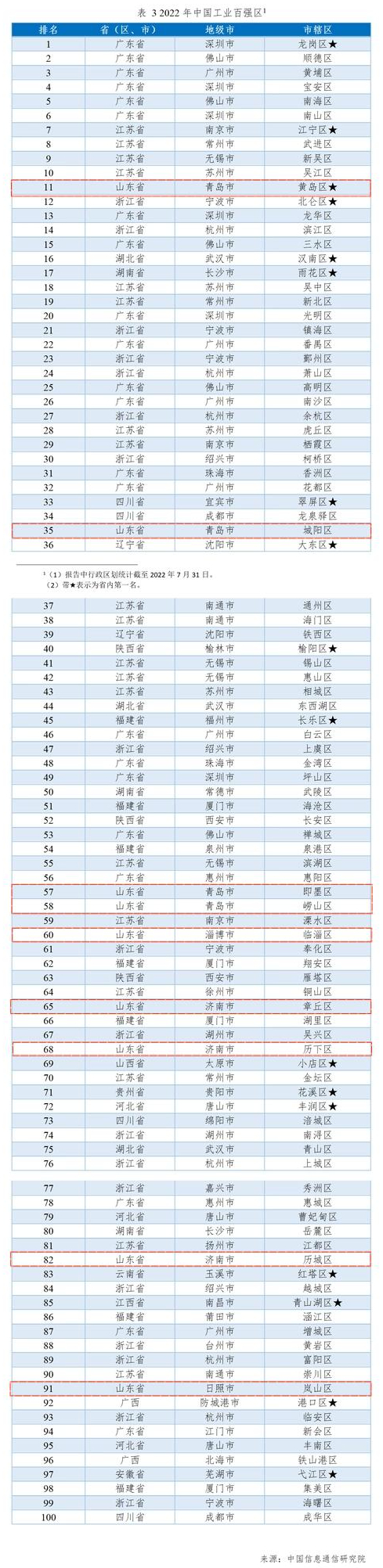 山东青岛市黄岛区、城阳区、即墨区、崂山区,淄博市临淄区,济南市章丘区、历下区、历城区,日照市岚山区等入选2022年中国工业百强区。