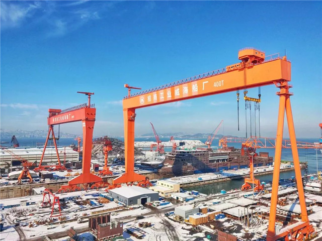 在招商局金陵船舶(威海)有限公司,工人们戴好安全帽和口罩,分工明确,忙碌地操作着,赶制为stena公司建造的第12艘E-Flexer高端客滚船,该船建造周期24个月,计划于2024年9月交付。