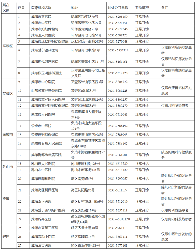 关于威海市发热门诊(诊室)和新冠肺炎医疗救治定点医院、亚(准)定点医院设置情况的通告