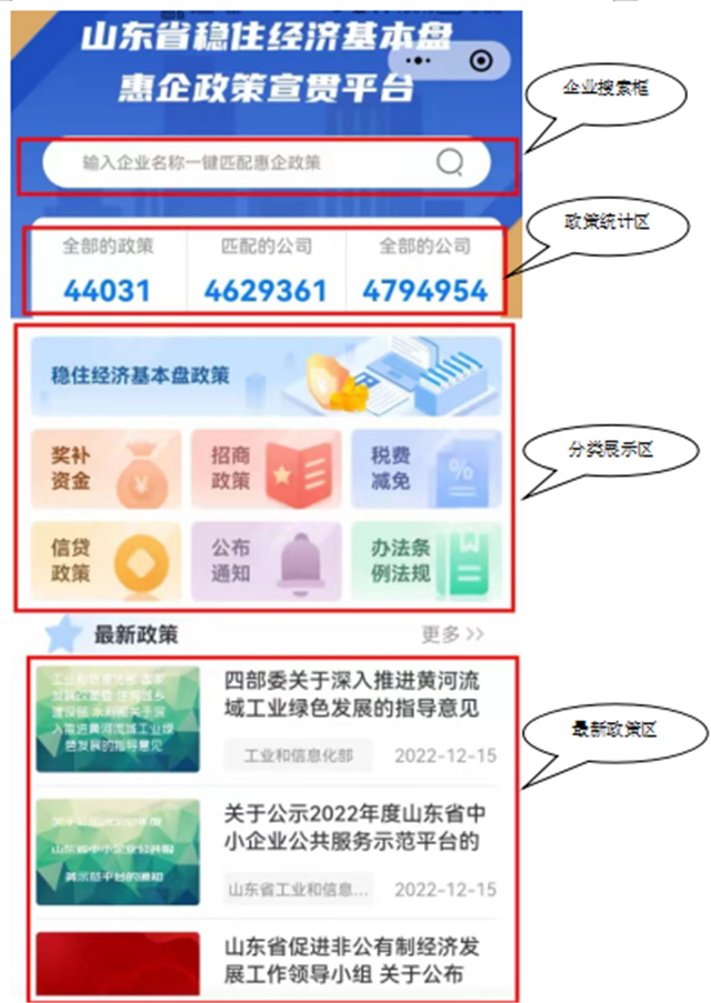 打开首页,从上到下,依次是企业搜索框、政策统计区、分类展示区、最新政策区。