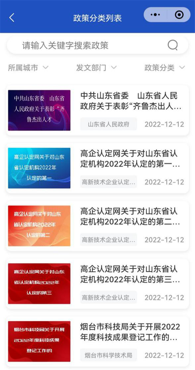 在首页点击分类展示区或最新政策区的更多按钮,可以进入到该页面。此页面上部为搜索选项,可以按照所属城市、发文部门、政策分类、关键字进行多种方式搜索到想找的政策。下面则是按照发布时间的倒序来展示所有符合搜索条件的政策。