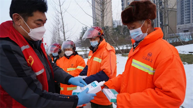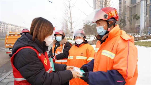 入冬以来,石岛环卫工人们日夜奋战,用辛勤的双手和汗水及时清除积雪、扮靓城市、美化生活。对此,港城石岛志愿服务总队先后多次开展了为环卫工人送姜汤、送御寒棉帽等活动。此次,志愿者们又将企业捐助的防疫用品送与环卫工人,希望他们能健康平安过年。
