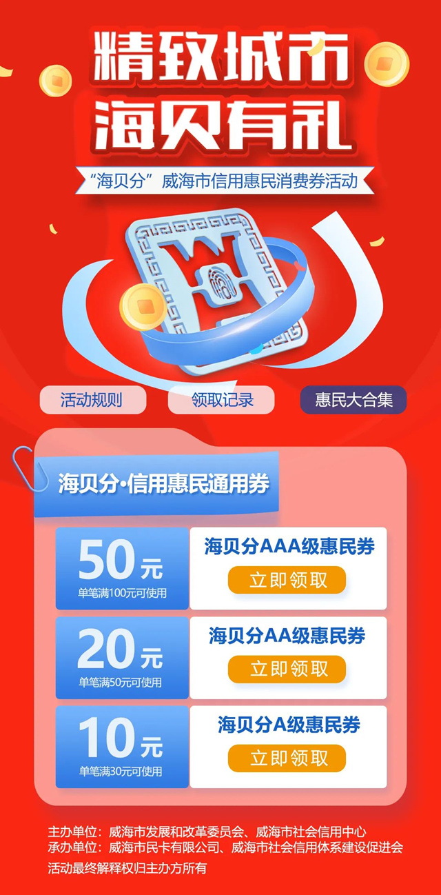 第二步,根据个人“海贝分”等级于规定时间参与抢券,领取到的信用惠民消费券自动存入微信“卡包”,惠民券设置有效期,以券面展示时间为准。