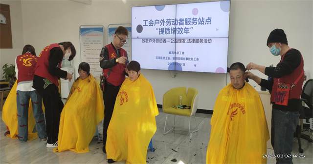 3月3日下午,环翠区鲸园街道古陌社区的户外劳动者服务站点内充满欢声笑语,由市总工会、市环翠区总工会联合开展的“致敬户外劳动者——公益理发·法律服务活动”正在进行。