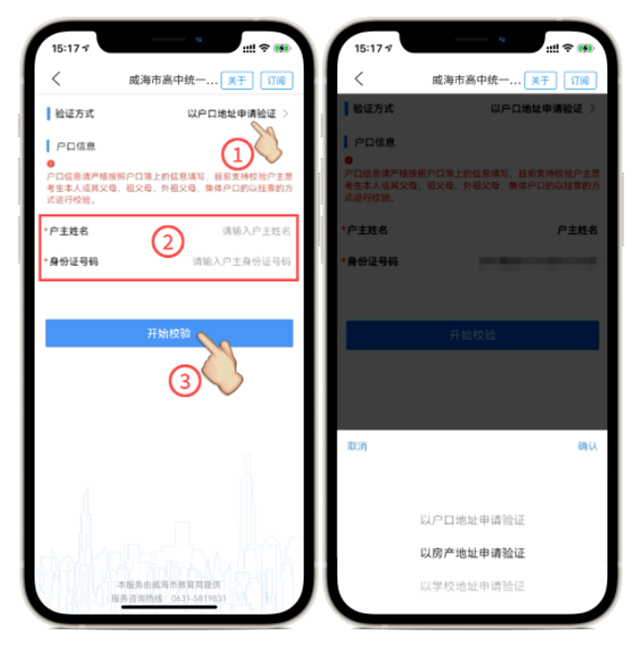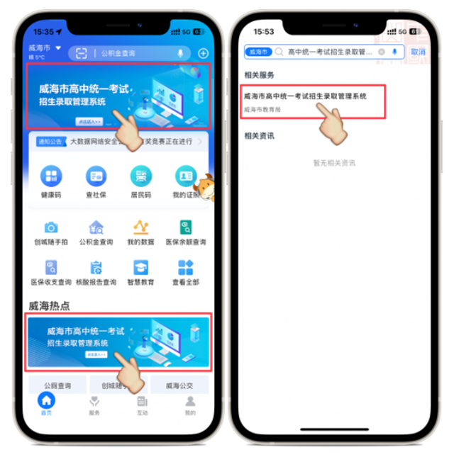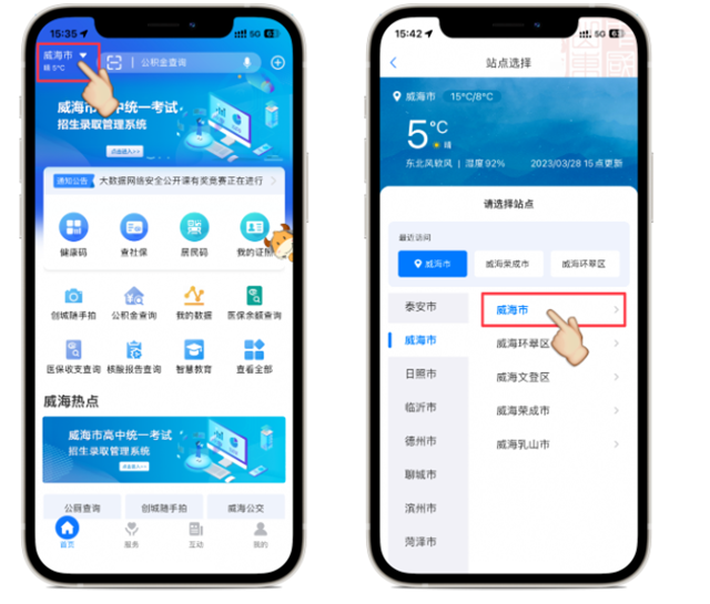 3月29日区域认定正式开启后,考生或家长进入“爱山东”App,注册账号并完成实名认证操作,然后点击首页左上角选择进入【威海市】。