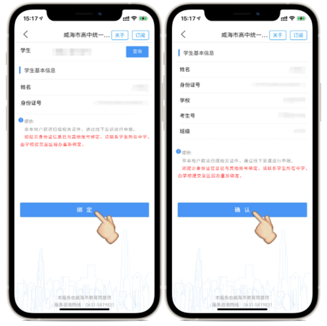 进入服务后,阅读《市直高中招生家庭区域审核协议》并确认,输入学生基本信息后点击【查询】-【绑定】,请认真核对身份信息是否真实有效,核对无误后点击【确认】进入下一步。