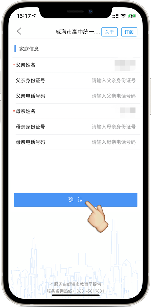 进入家庭信息填写页面,请依次完善各项信息,确认无误后点击【确认】按钮进入下一步。