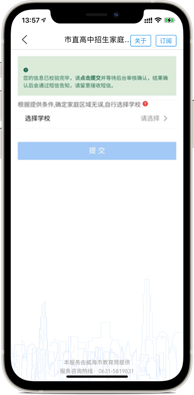 ● 校验通过:提交校验后,若提交信息无误,系统会提示您的信息已校验完毕,请选择学校后点击【提交】按钮等待后台审核确认,确认结果会通过短信方式告知。