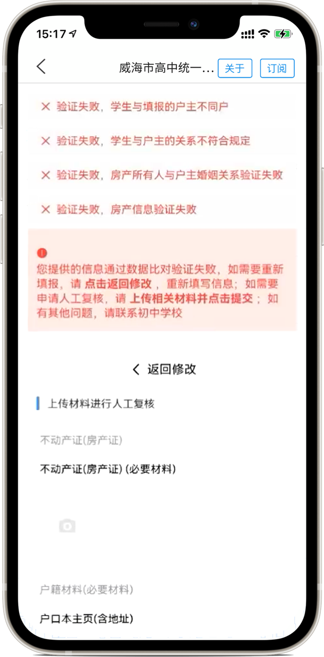 ● 校验不通过:若系统校验您提交的材料有误,可以点击【返回修改】重新填写,也可以上传相应证件,然后点击【提交】按钮进行人工复核。人工复核结果会以短信形式告知申请人。
