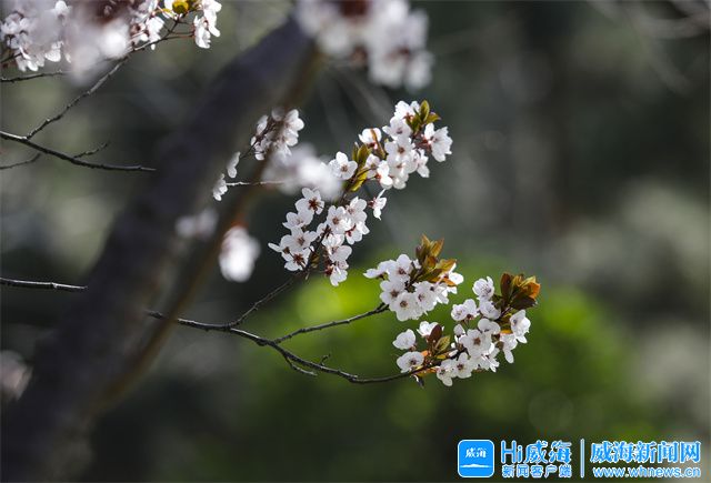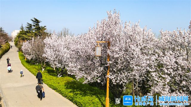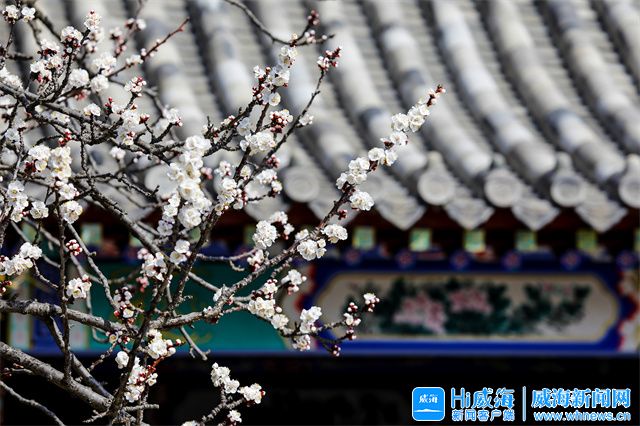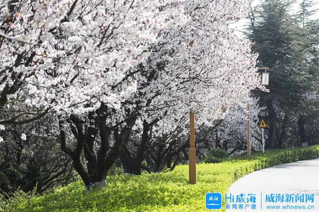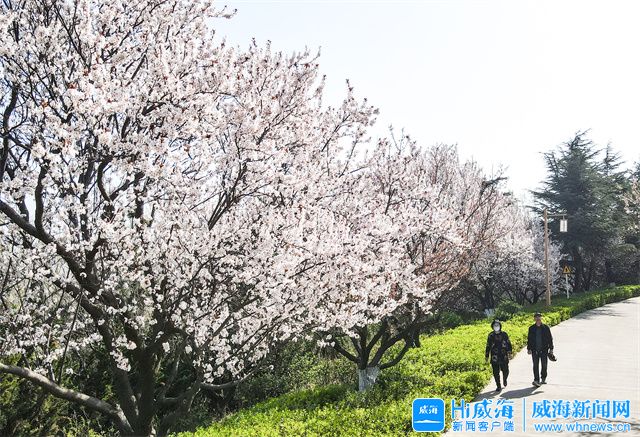 在环翠楼公园,一株株杏树花应时绽放,竞相绽放的杏花洁白似雪,在春风中一争芳菲。