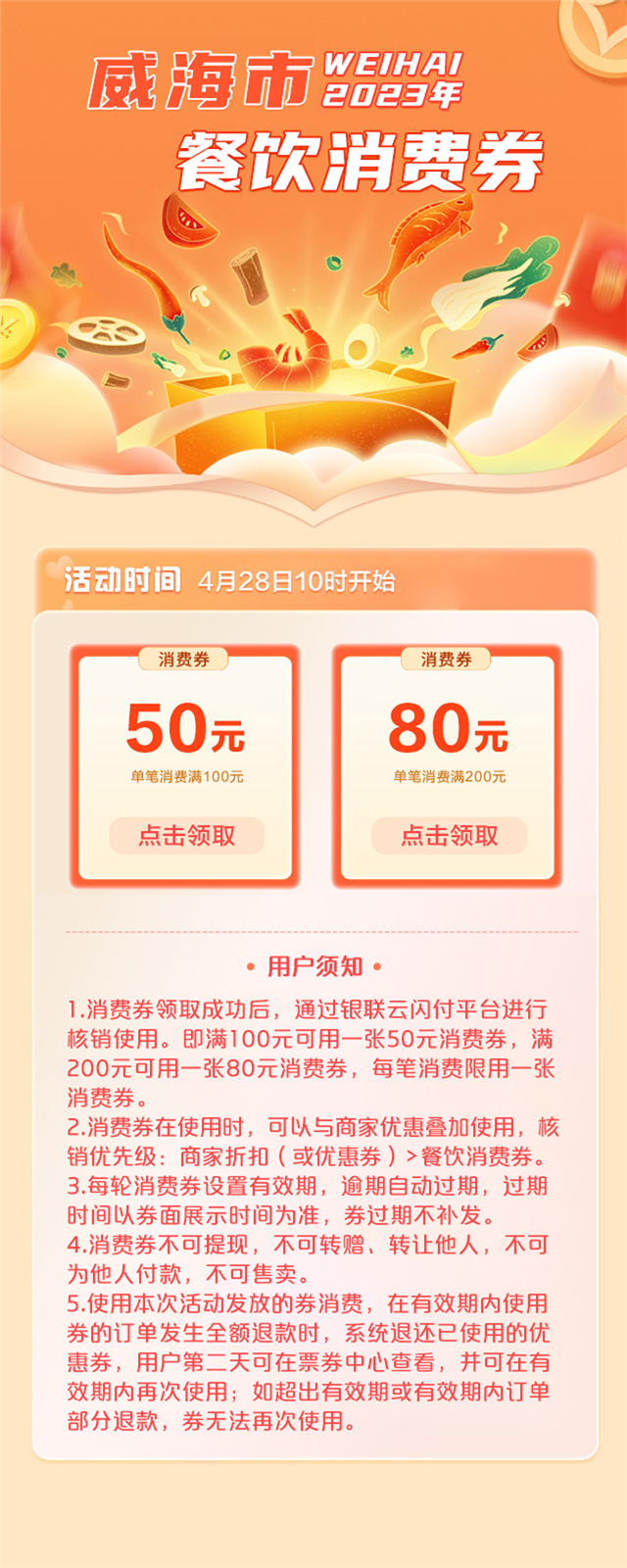 4月28日10:00,近4.5万张第二轮威海市餐饮消费券在“云闪付”APP准时开抢!