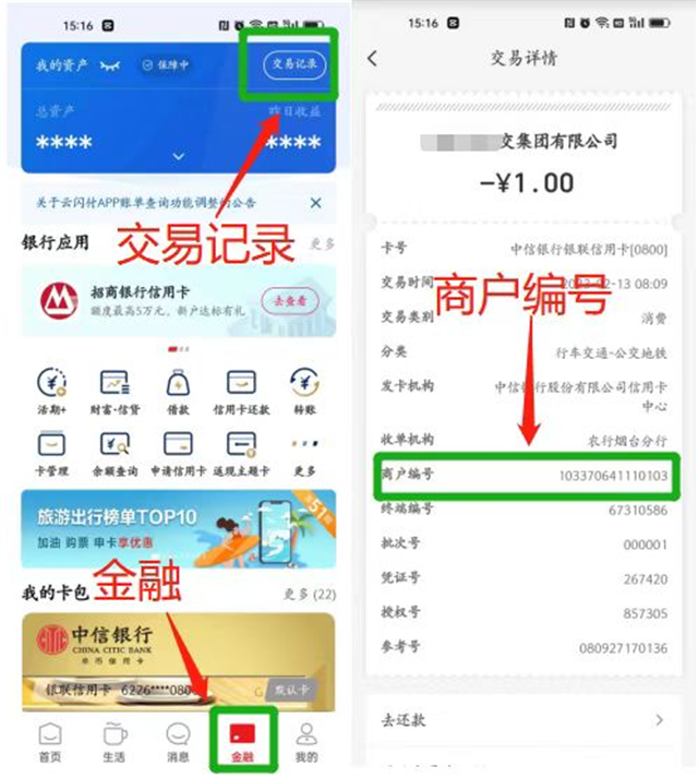 2.通过“云闪付”在该收款终端完成至少0.01元交易,检查是否支持“云闪付”结算,交易后通过“云闪付”交易记录查看商户编号(商户编号查询方式如下图)。