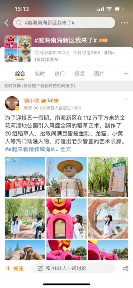 之前,威海市新媒体协会组织威海本地大V开展“威海南海新区我来了”线下采风活动,活动话题总阅读量超过2600万,收获点赞60万个,还创作了活动直播相册,精选照片300张,吸引游客的关注和热情,在抖音、今日头条、微博、百度、携程、小红书等平台,推广南海新区好吃的好玩的打开地。