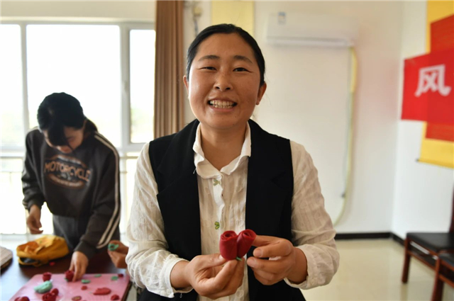 同样是以花为礼,观海社区的心意多了些“面香味”。走进社区活动室,一张长桌上堆放着篦子、擀面杖、各色面团,社区邀请了志愿者王小燕现场教妈妈们做花饽饽。“这次我特意为母亲节选了玫瑰花、康乃馨和锦鲤鱼的花样,也是对各位母亲的一种祝福。”王小燕说。跟着老师的教学,居民王新艳又添了些创意,用面团制作成一对玫瑰,取名“花开并蒂”。“今天不光我过节,我作为子女也要为母亲献上一份心意。”王新艳虽然已经是两个孩子的妈妈,但是也牵挂着自己的母亲,一旁的儿子还不会揉面,用面团拼凑出一个爱心送到她跟前。“这次我们邀请母亲带着孩子们参与活动,让孩子们学会表达对母亲的爱意和感激之情。”观海社区网格员周小慧说。