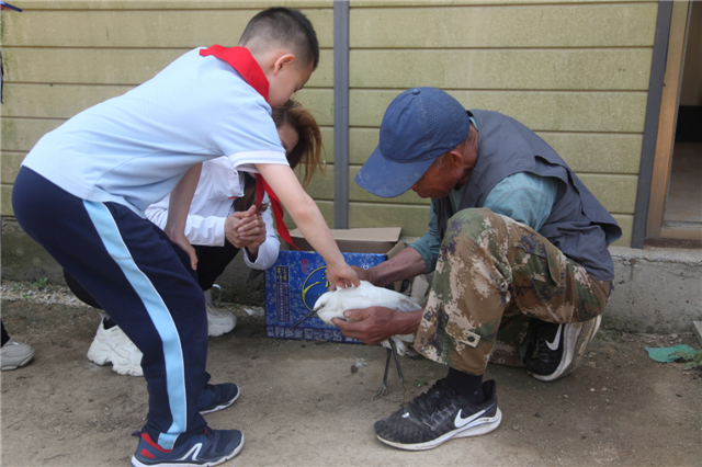 5月15日,在南海新区第一实验小学的升旗仪式上,三年级同学于知元获得了“保护野生动物小卫士”荣誉证书,进行了全校表扬,随后班主任开展了保护野生动物主题班会,让于知元分享了自己的救助过程,而这还要从他救助国家二级保护动物白鹭说起。