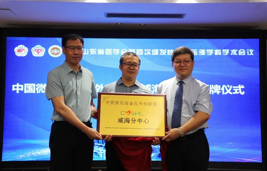 开幕式上,山东省立医院泌尿微创外科主任蒋绍博、山东大学齐鲁医院泌尿外科主任史本康、威海市中心医院院长隋海明分别致辞。随后,蒋绍博、隋海明共同为“中国微创高血压外科联盟威海分中心”揭牌,标志着威海地区继发性高血压诊治工作将得到进一步规范和提升。