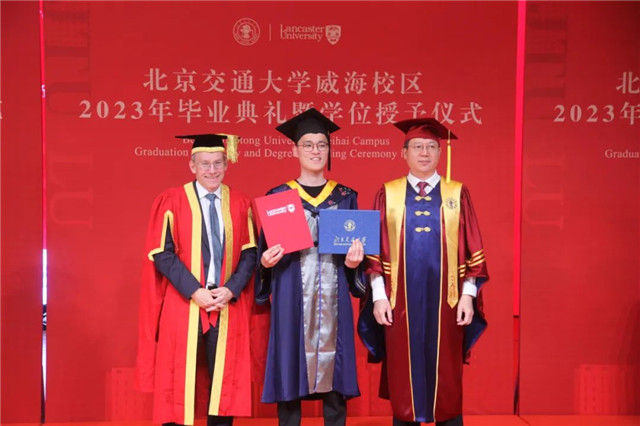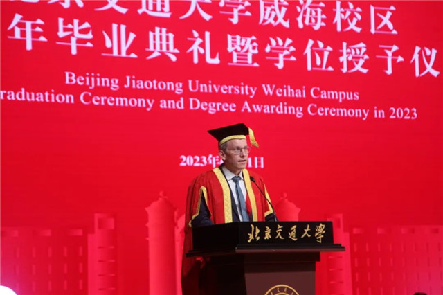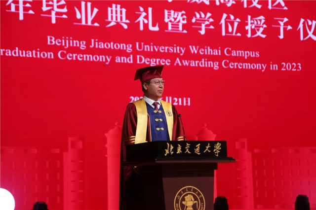 6月21日,北京交通大学威海校区举行2023年毕业典礼暨学位授予仪式。北京交通大学校长余祖俊、美国罗切斯特理工学院校长戴维·曼森、英国兰卡斯特大学校长安迪·斯科菲尔德发表毕业赠言,深情寄语毕业生,并为每一位毕业生逐一拨穗正冠、授予学位证书。