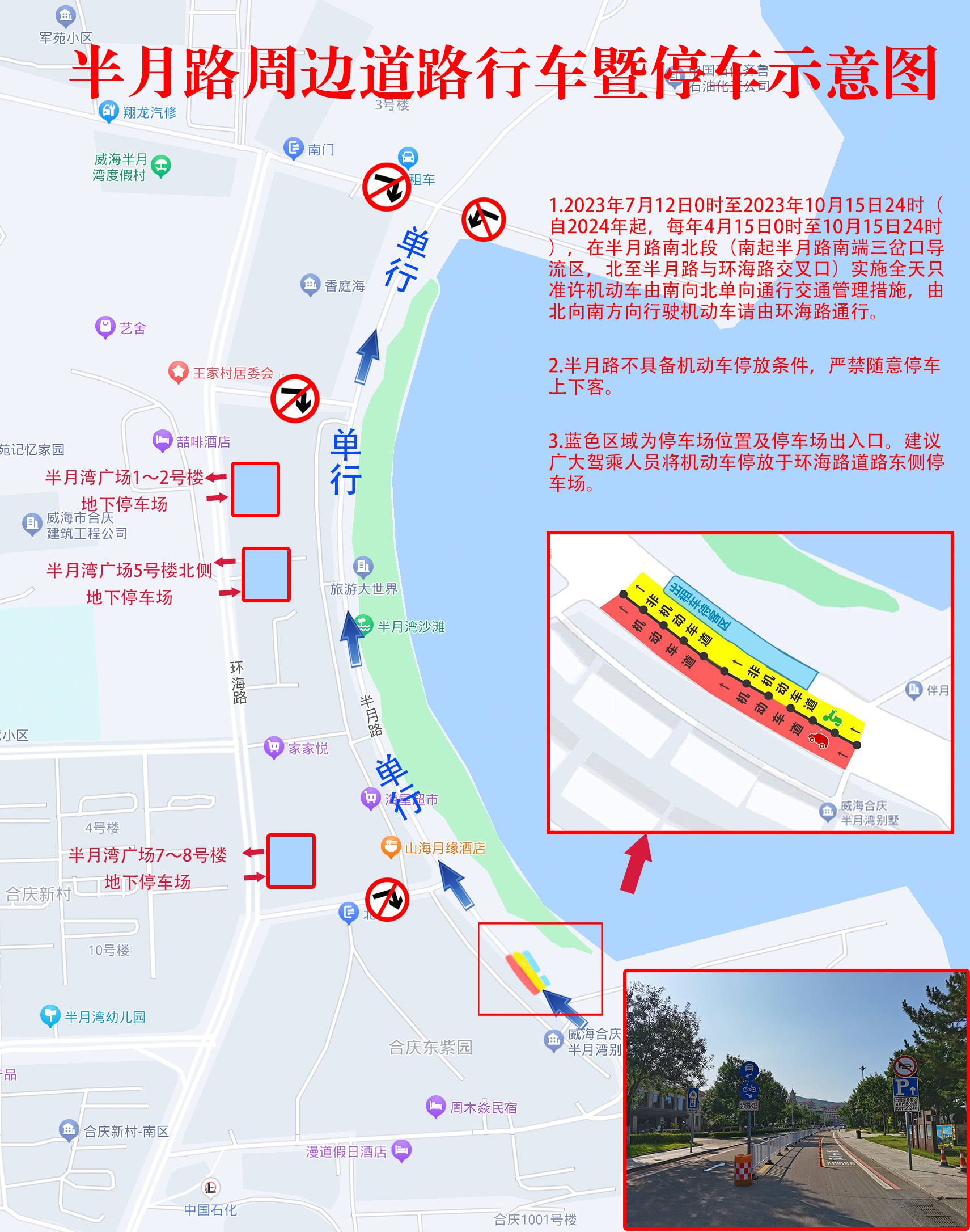 半月路不具备机动车停放条件,不允许随意停车上下客。建议广大驾乘人员将机动车停放于环海路道路东侧停车场。因半月路附近停车资源有限,提醒广大外地游客和本地市民合理选择出行方式,尽量选择公交车、出租车等公共交通方式出行。