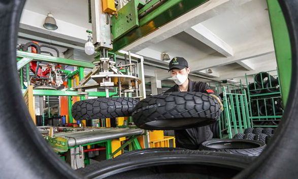在腾森橡胶轮胎(威海)有限公司车间内,工人正在生产摩托车轮胎。