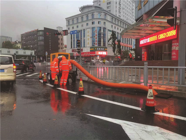 防汛人员冒雨对积水路段抽排水。环翠区市政园林服务中心供片