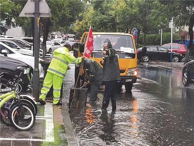 8月28日10时许,市区百货大楼门前,车辆川流不息,几名身着橘黄色雨衣的防汛人员正在冒雨清理雨水井中的落叶。一旁插着红色、黄色安全警示旗的雨水箅子旁,一辆排水车正在待命。
