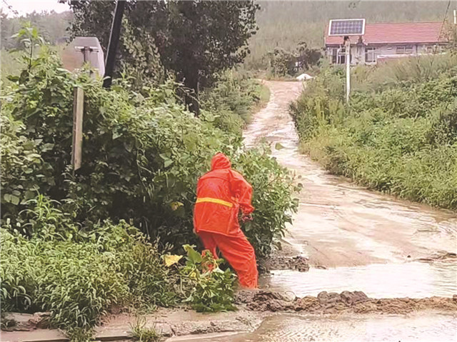 一名公路巡查人员在冒雨排水。市公路事业发展中心供片