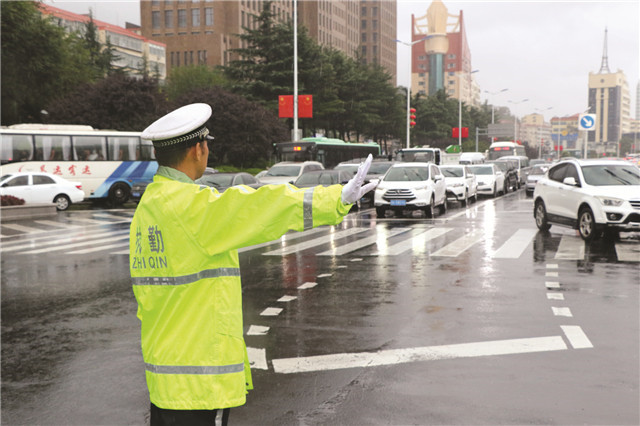 交警冒雨指挥疏导交通。市交警支队供片
