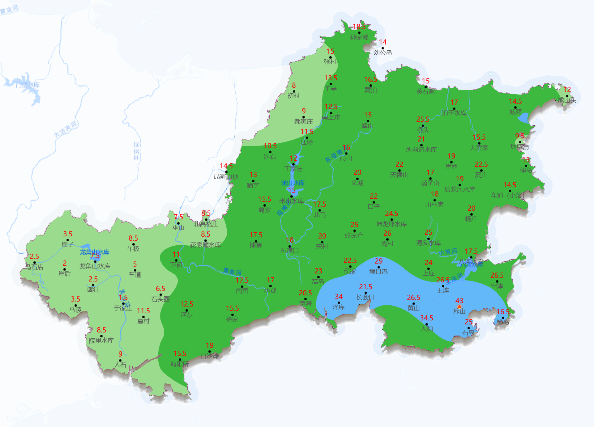 据威海市水文中心监测,9月24日13时至25日12时,全市平均降水量15.6(单位:mm,下同),环翠区15.9,文登区19.0,荣成市20.5,乳山市7.9,高新区8.5,经开区15.5,临港区13.3,南海新区19.8。最大降水量站点荣成市斥山43.0。
