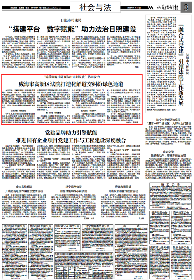 近日,《山东法制报》以《“诉前调解+部门联动+审判提质”协同发力,威海市高新区法院打造化解“道交”纠纷绿色通道》为题,聚焦高新区法院打造高效便捷的道路纠纷化解新模式的经验做法,以下为报道全文: