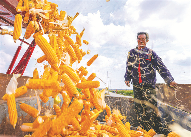 10月10日,在荣成市滕家镇东滩郭家村,村民们正在收获、晾晒玉米。近年来,荣成市聚焦“保面积、提产量、促增收”,大力实施粮食提质增效工程,推广“减垄增地”集约经营和“跨区协作”托管服务模式,加大高标准农田、粮食烘干仓储等基础设施配套,全链条保障粮食稳产增收,将丘陵薄地变成稳产“良田”,让规模种粮成为保障粮食安全、促进集体增收的富民产业。