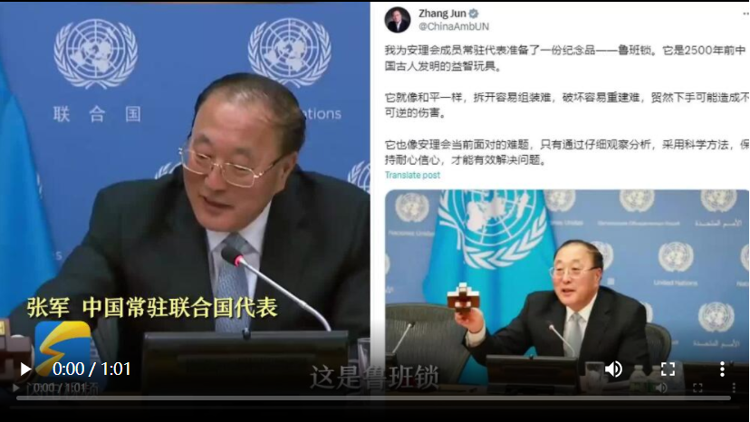 11月1日,中国担任联合国安理会11月轮值主席。中国常驻联合国代表张军向各国代表赠送鲁班锁。据悉,这批被推荐给联合国成员国的鲁班锁,由山东枣庄滕州鲁班天工木艺有限公司定做。鲁班锁,传说为春秋末期鲁国人鲁班的发明,是从古代流传至今的民间木艺智力玩具。2021年,“鲁班锁制作技艺”入选山东省第五批省级非物质文化遗产代表性项目名录。(来源:闪电新闻)