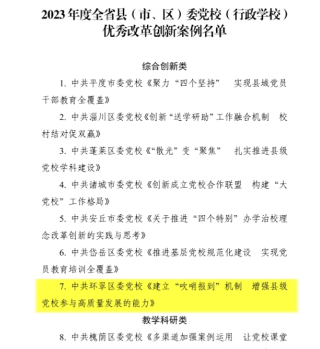 近日,环翠区委党校《建立“吹哨报到”机制 增强县级党校参与高质量发展的能力》获评2023年度全省县(市、区)委党校优秀改革创新案例。